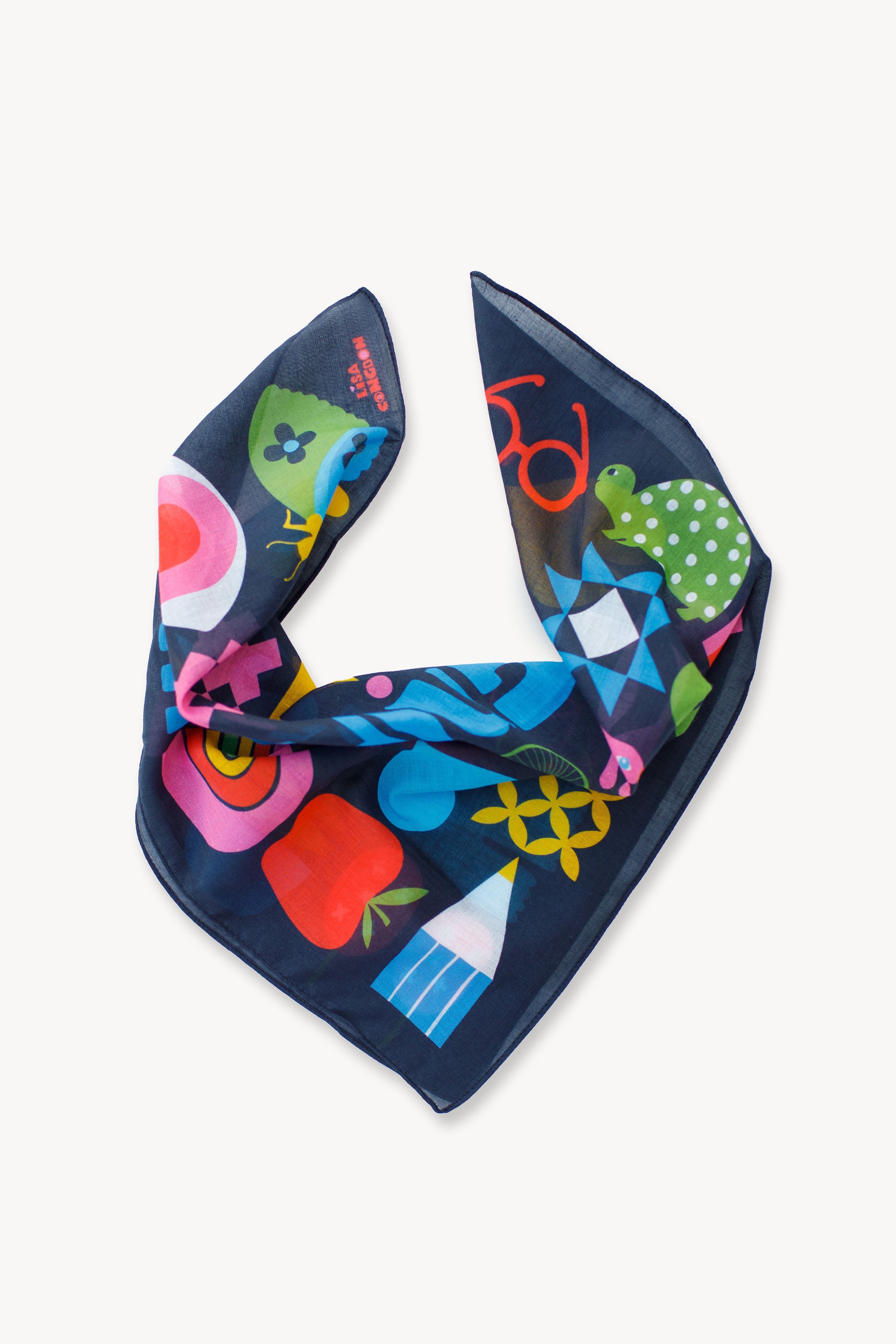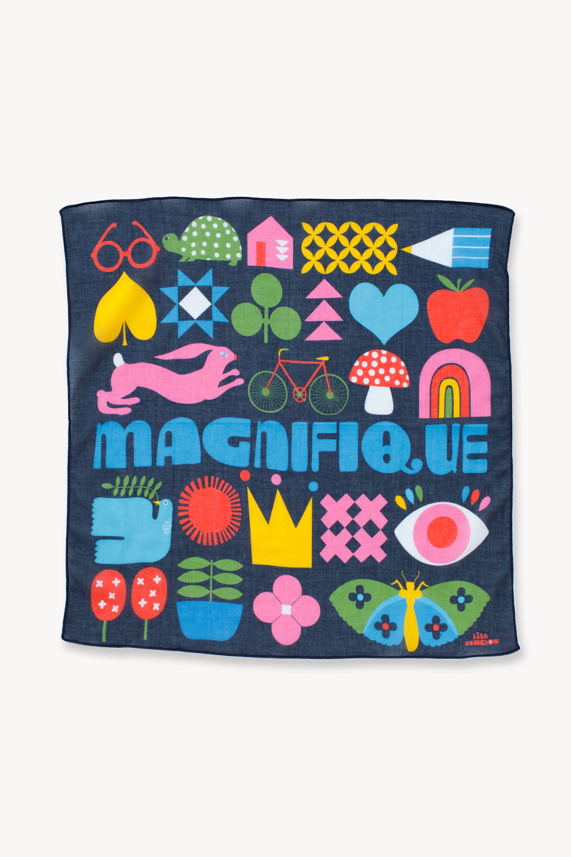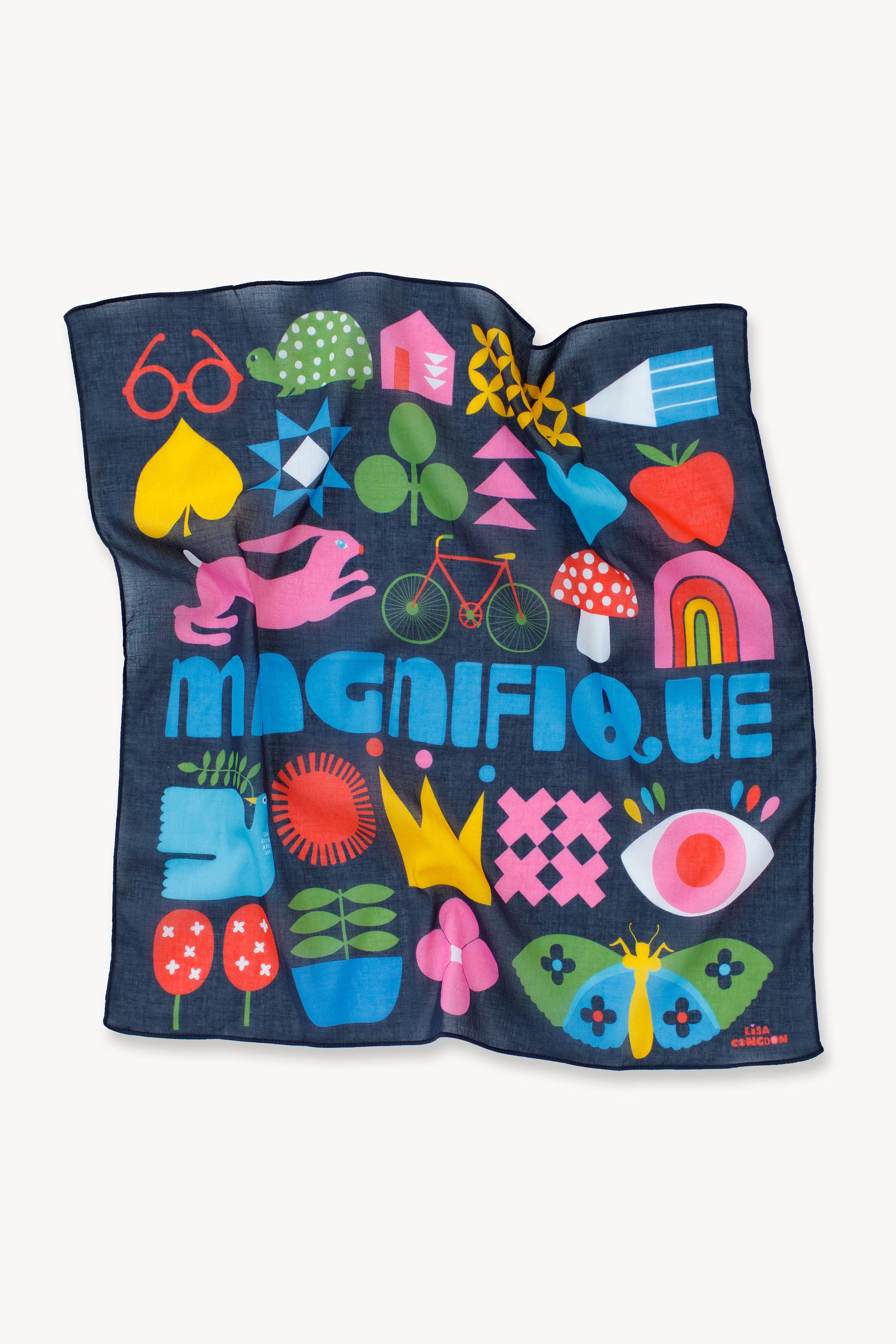 "Magnifique" means "magnificent" in French — and this scarf lives up to the name. Featuring some of Lisa’s favorite icons on a bold black background, this lightweight scarf can be worn year-round.