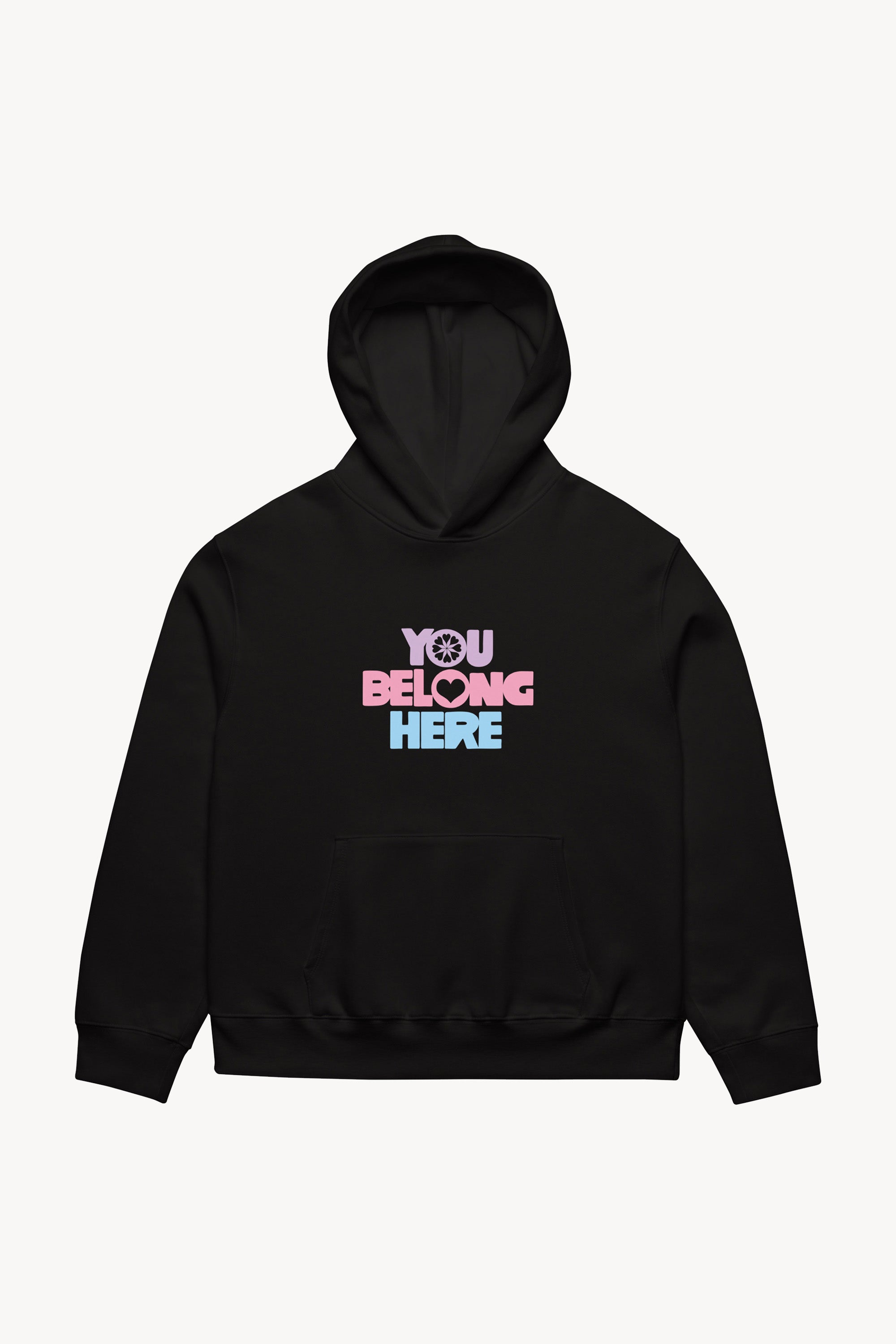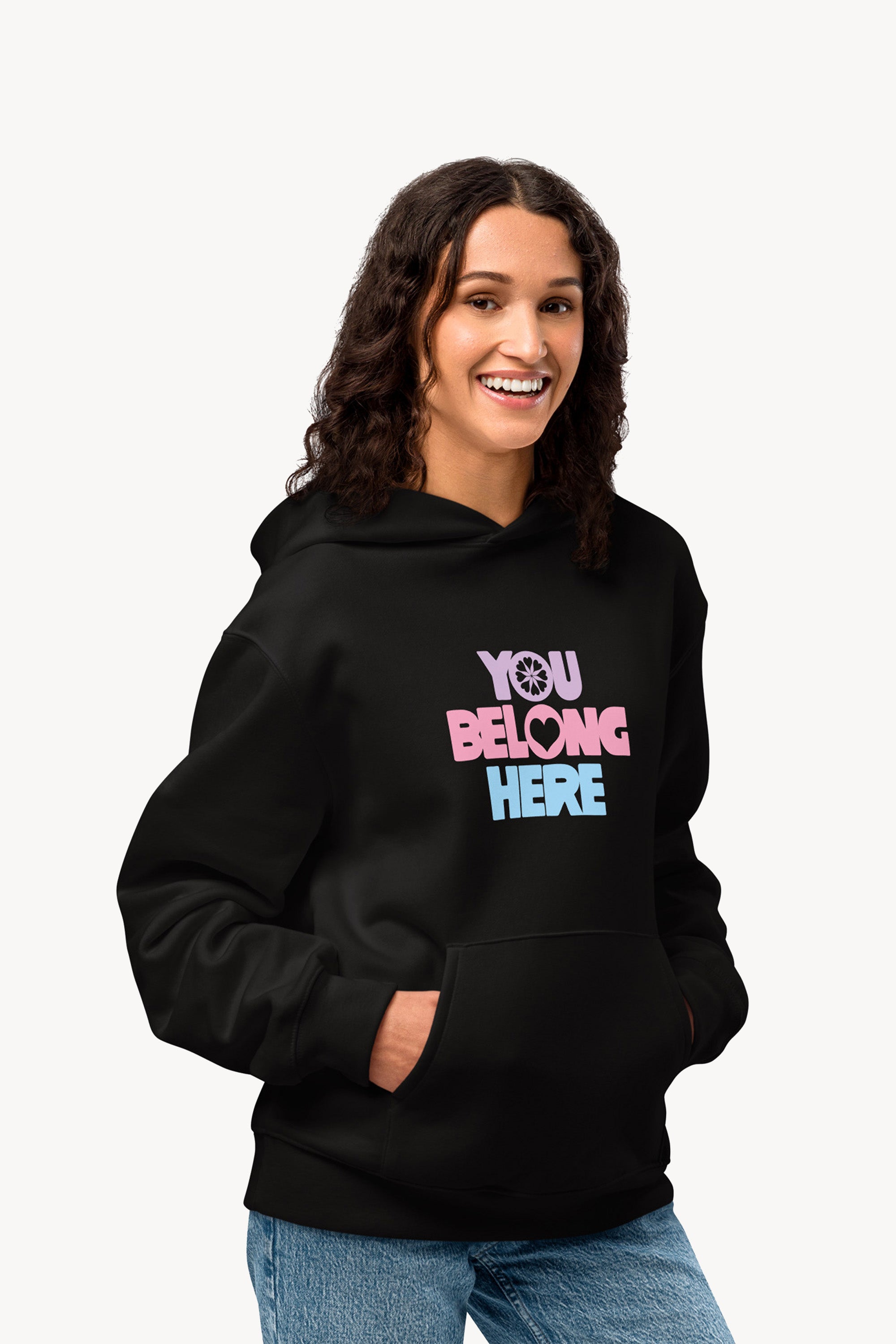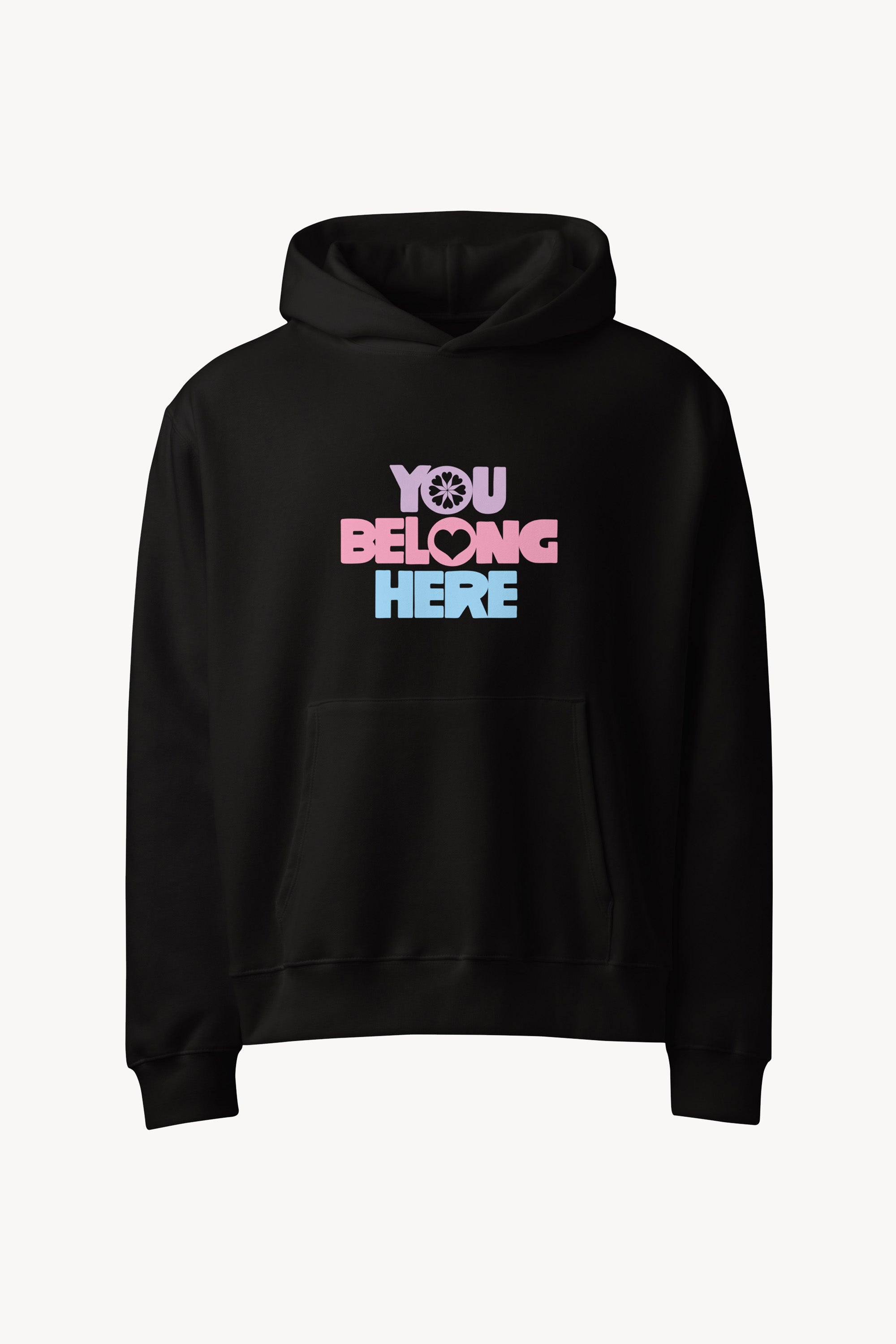 You Belong Here black heavyweight hoodie. Thick and soft and made to lounge, this hoodie will keep your head and hands warm! We found a print-on-demand production partner so each one is made for you and we have no waste! That means this part of your order will ship separately from the rest.