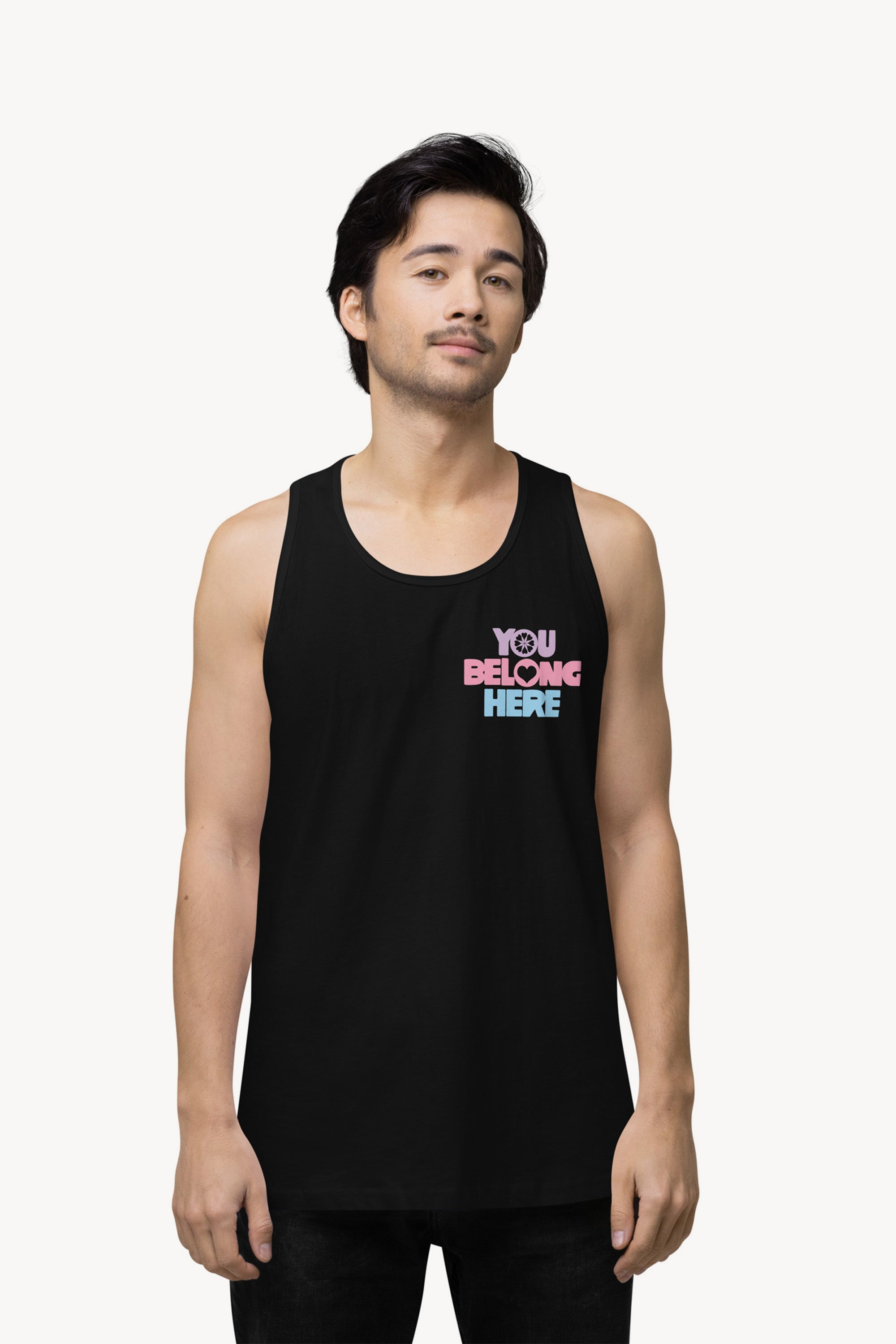 You Belong Here black tank top. Durable and soft cotton fabric with a drop arm. We found a print-on-demand production partner so each one is made for you and we have no waste! That means this part of your order will ship separately from the rest.