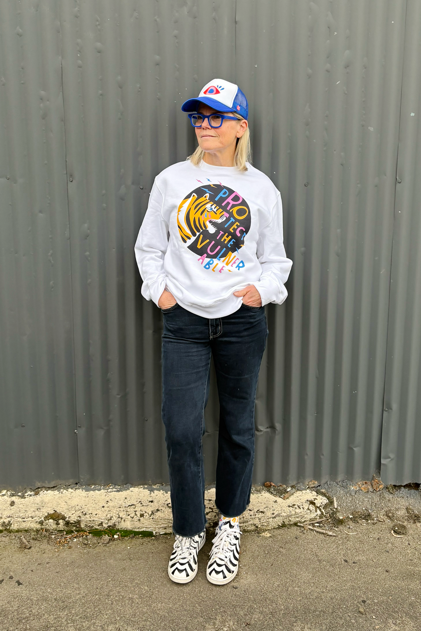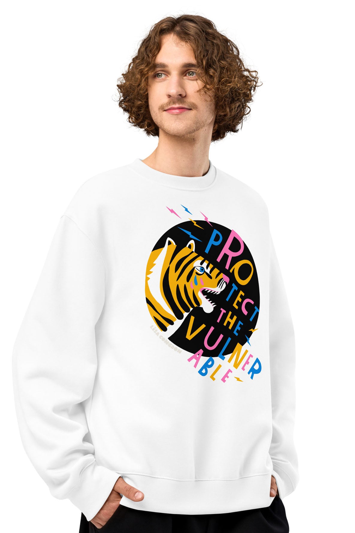Protect the Vulnerable heavyweight white sweatshirt. Cozy oversized fit with slightly dropped sleeves. We found a print-on-demand production partner so each one is made for you and we have no waste! That means this part of your order will ship separately from the rest.