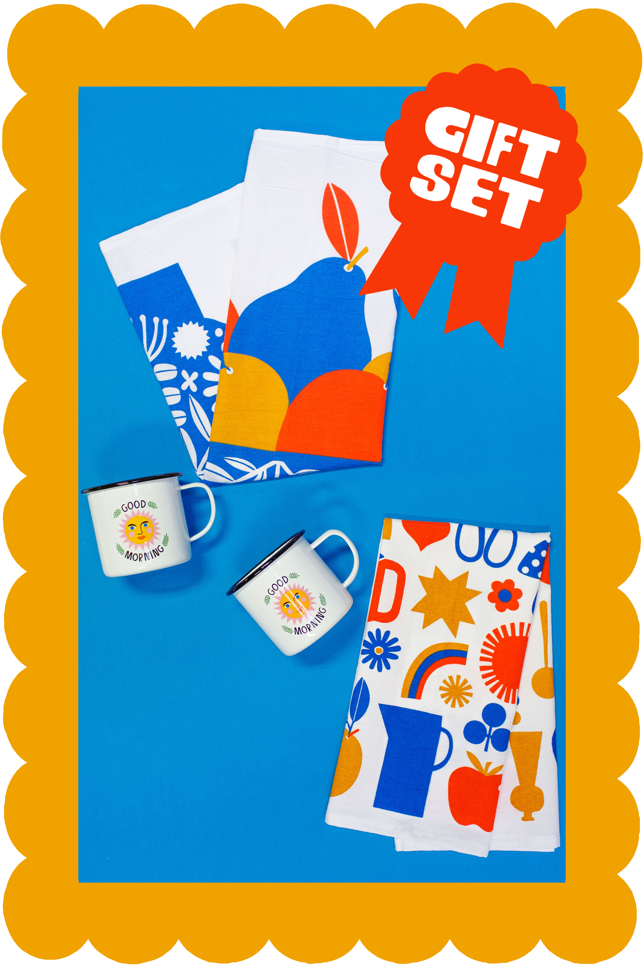 Start the day enveloped in warmth with this collection of two Good Morning Mugs and a set of two of our favorite kitchen towels.
