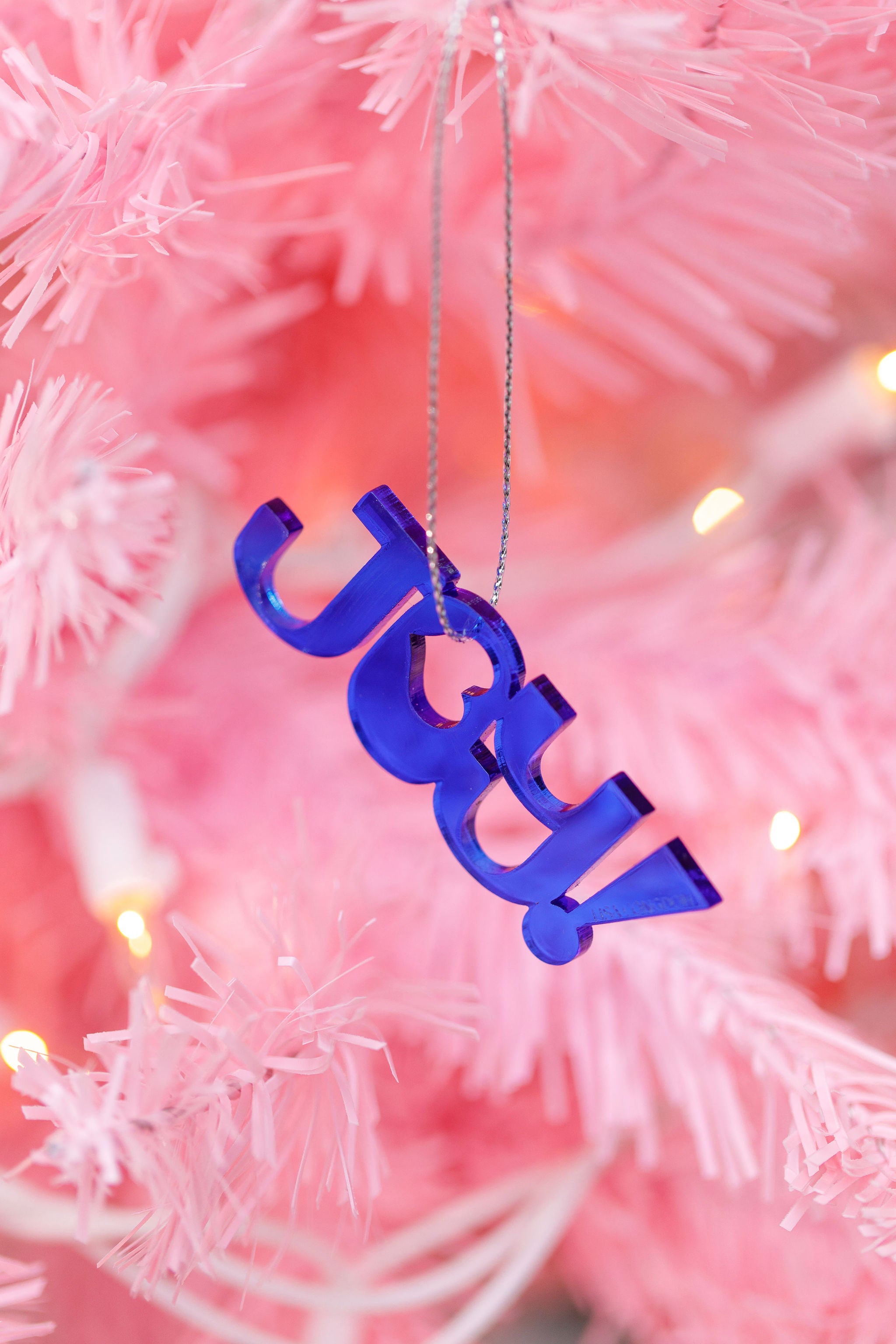 This deep blue JOY ornament features Lisa’s hand-lettering and adds a bright touch to your tree or gift. The blue is transparent and allows light to glow through.