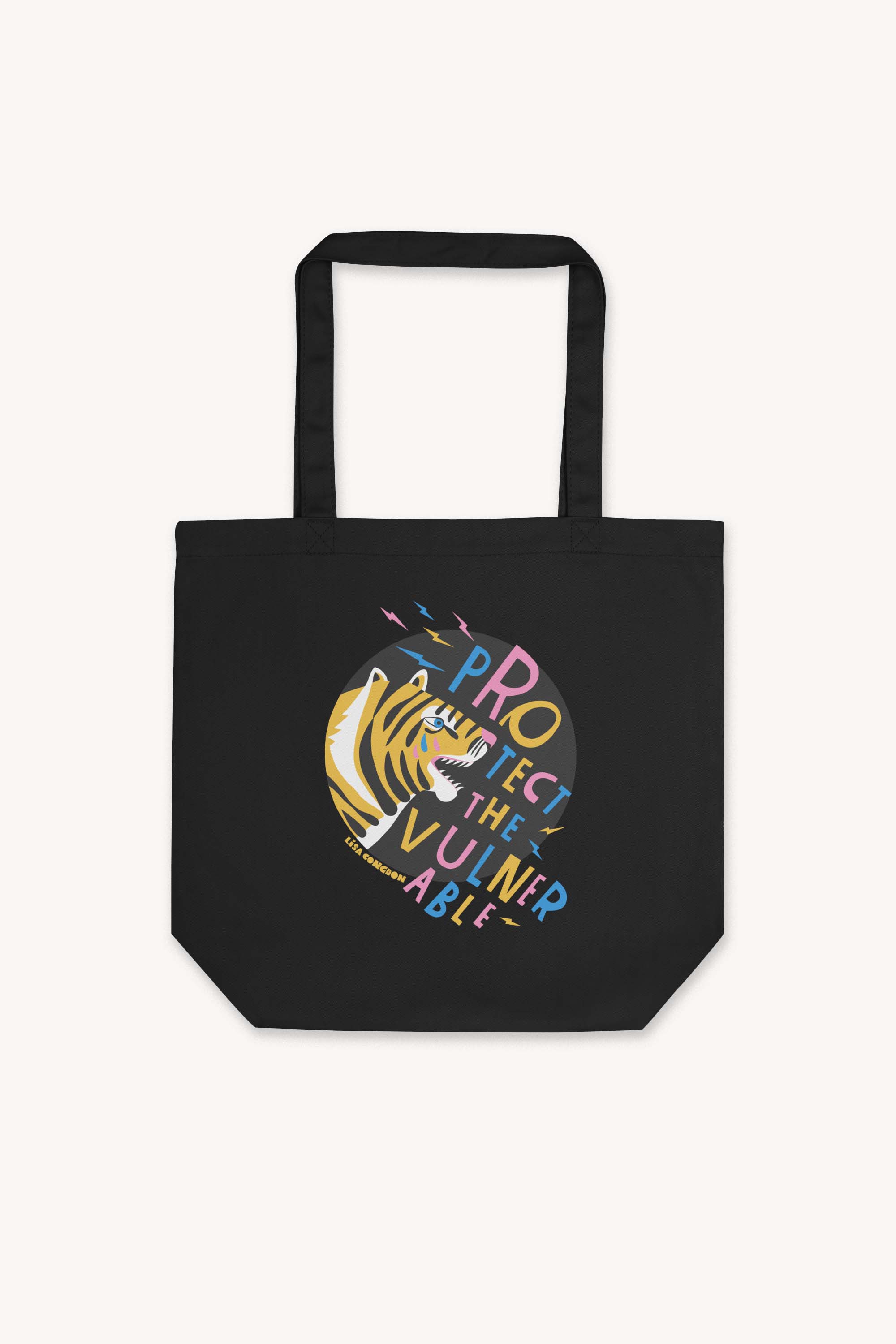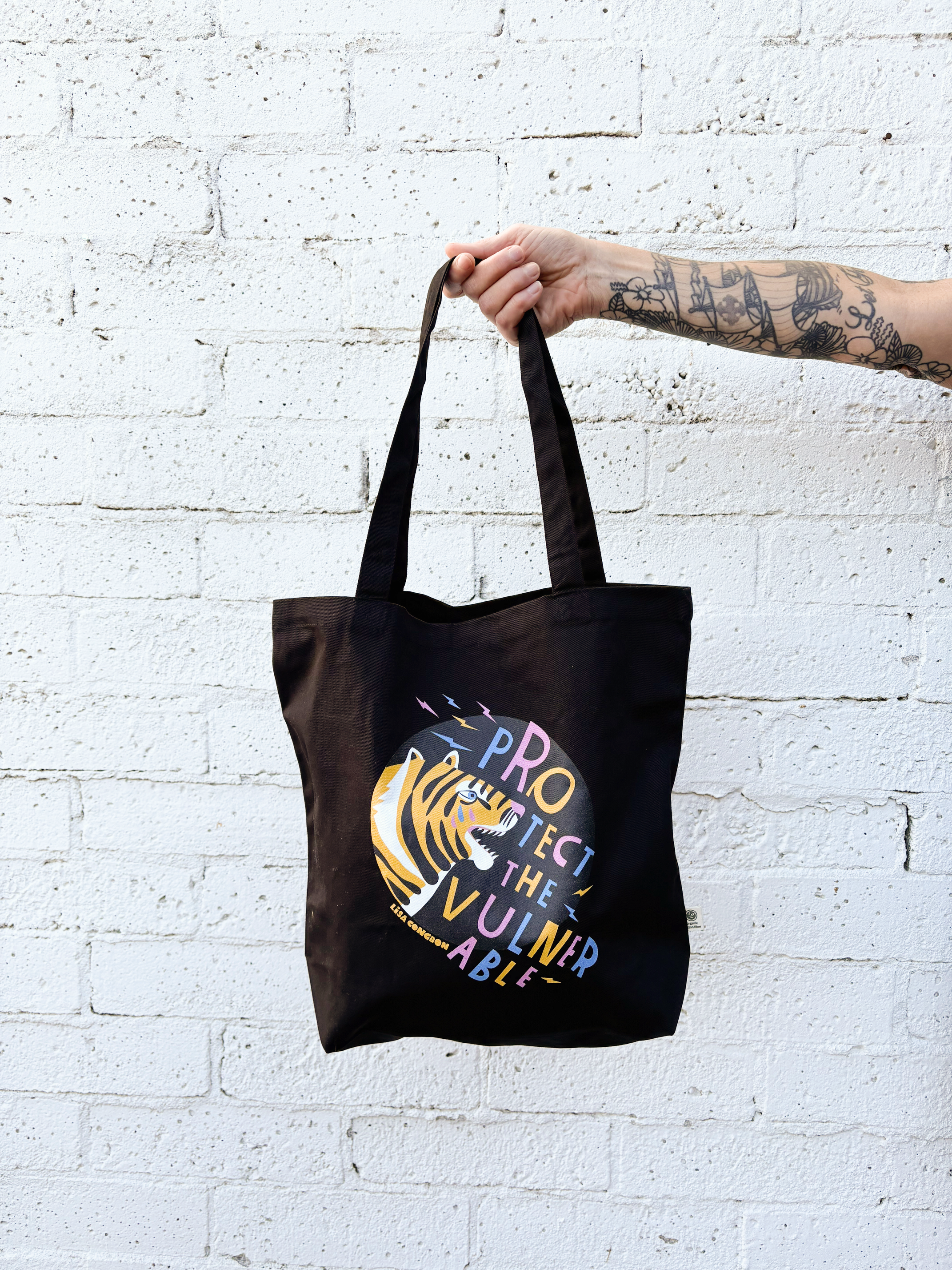 Organic cotton tote featuring Lisa’s iconic protect the vulnerable tiger. Slightly larger than your average tote, for when you have a little more to carry. For this item, we partner with a print-on-demand service so each one is made for you and we have no waste! That means this part of your order will ship separately from the rest.